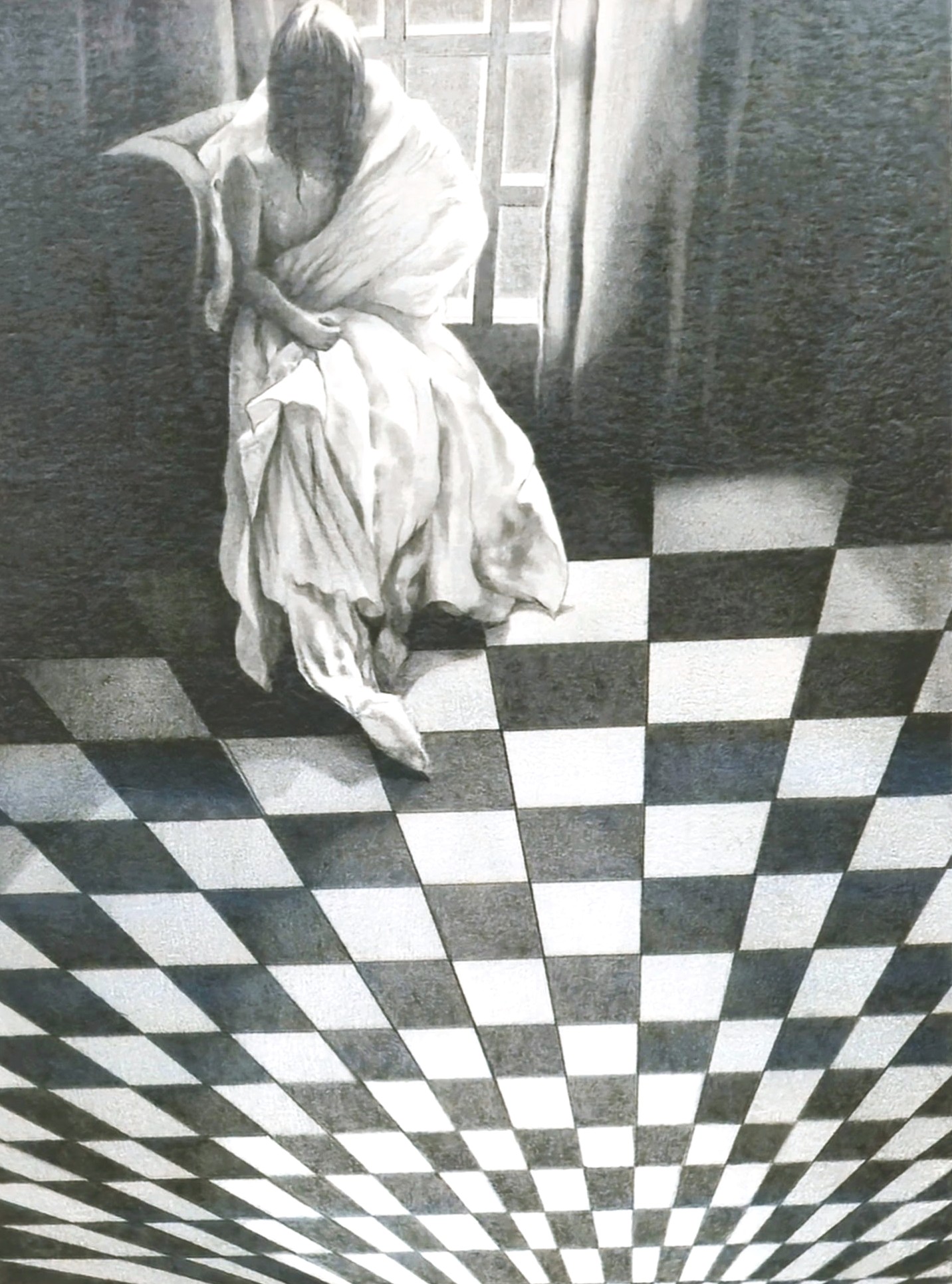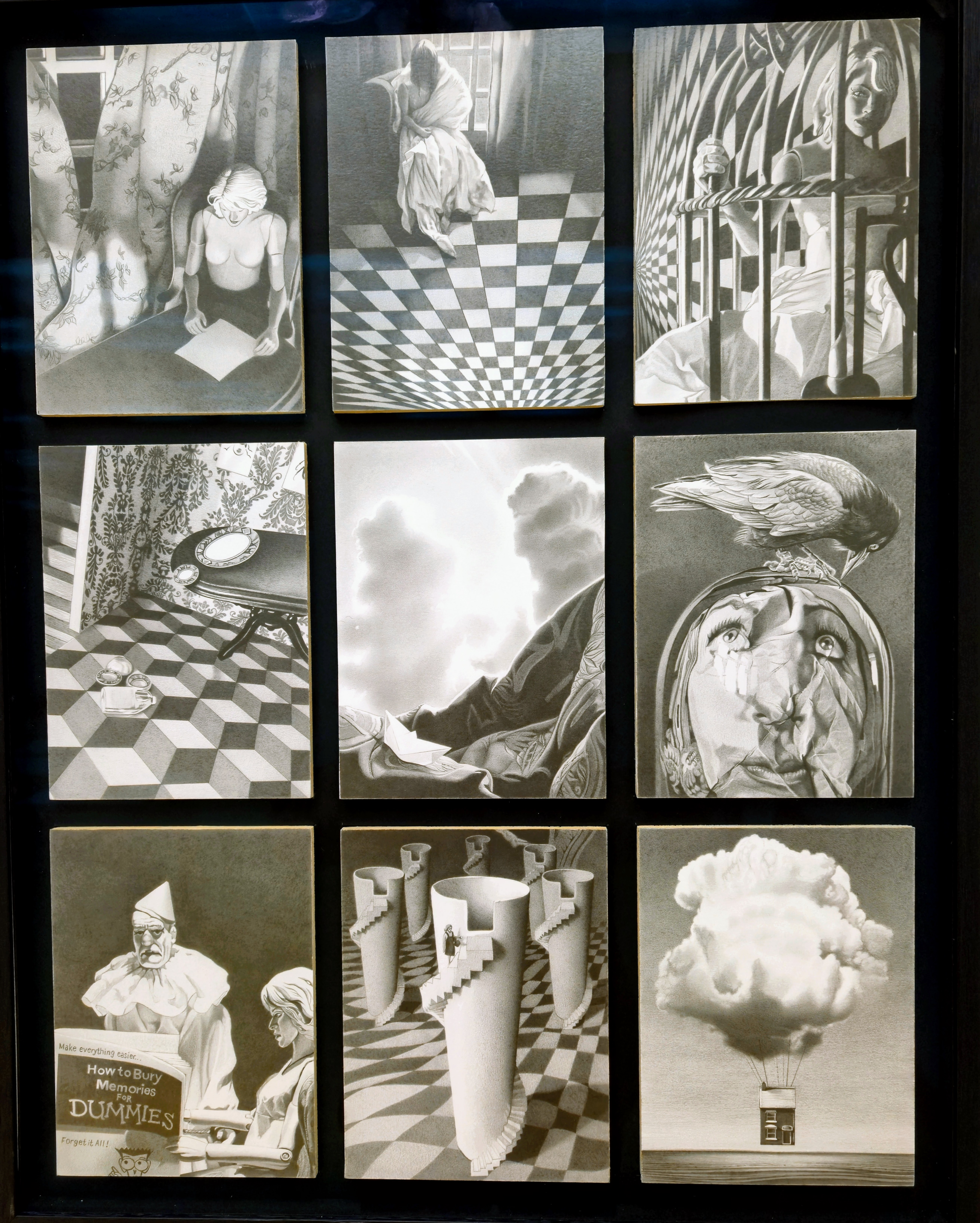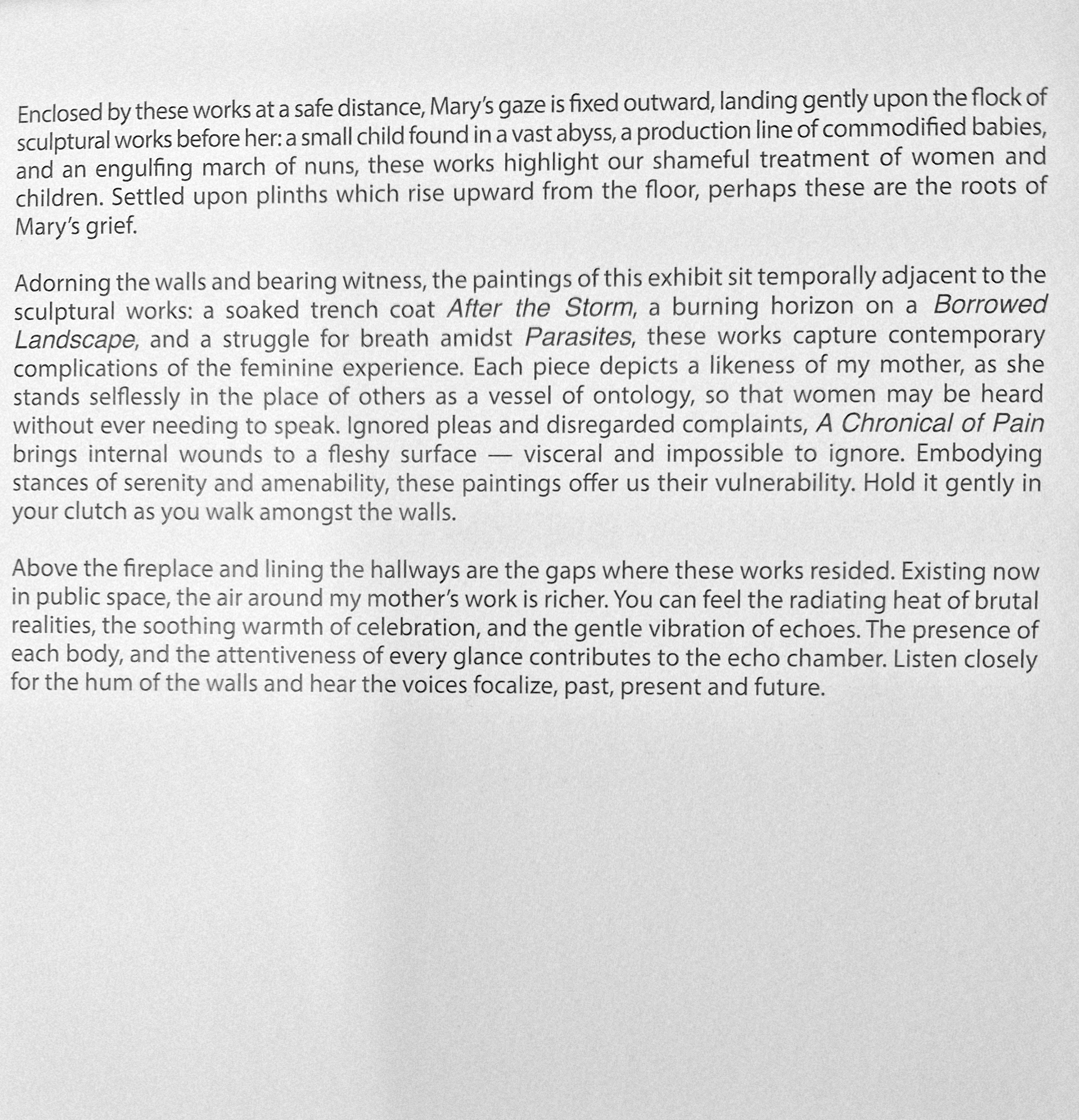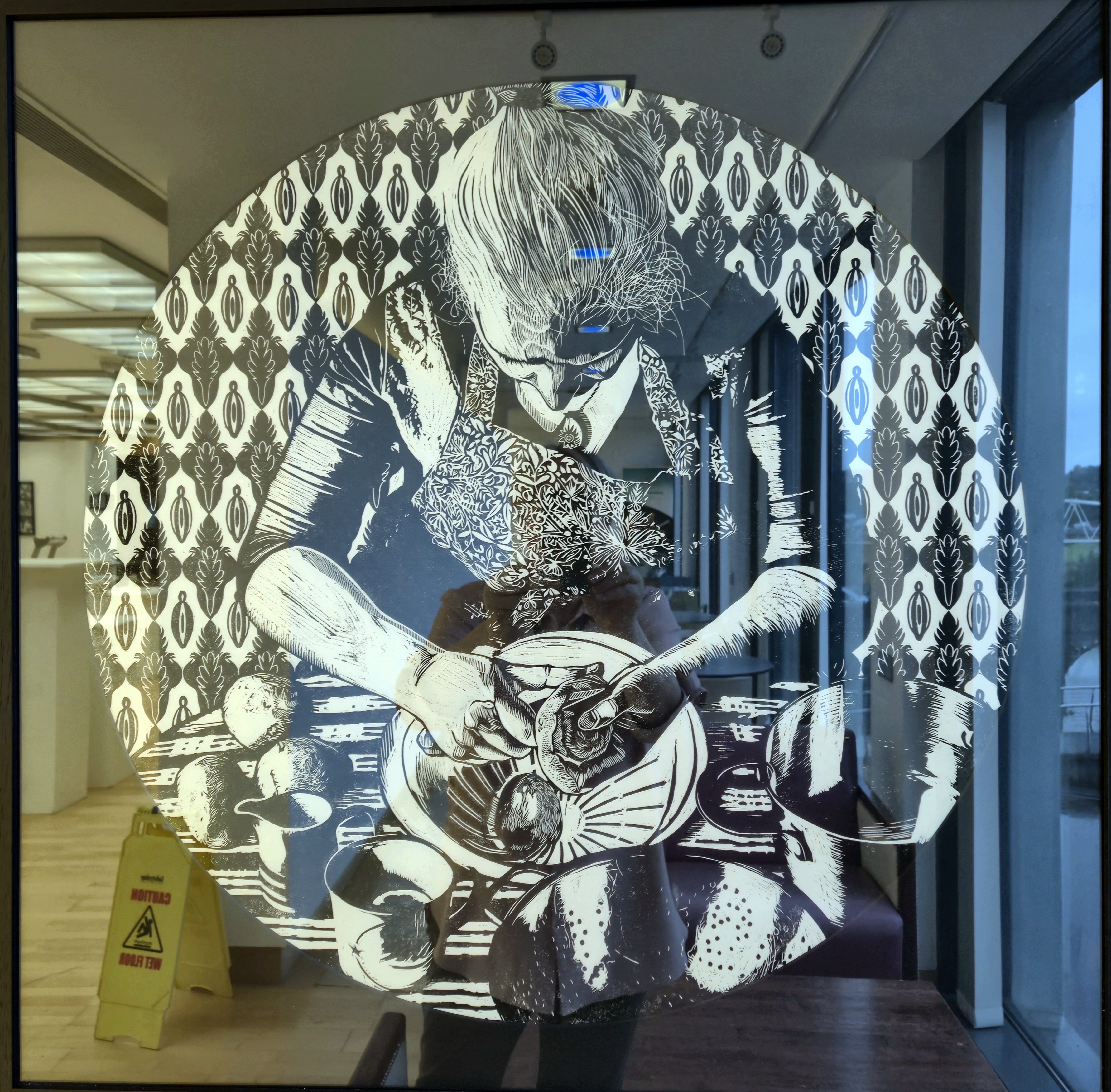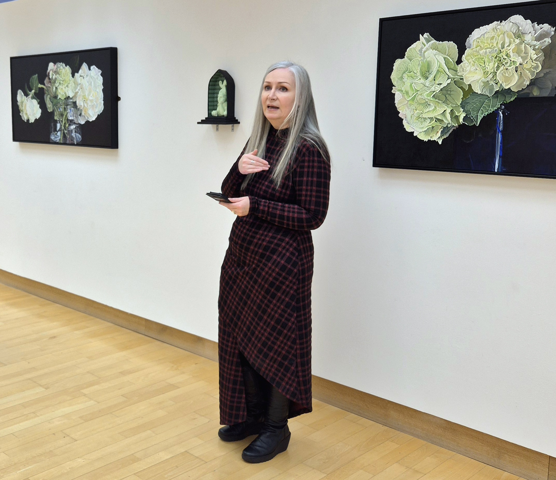 According to the artist, Jackie Hudson Lalor’s art practice features four strands: oil painting, drawing, printmaking and sculpture. Her work is: “representational and detailed with a surreal sensibility” (Hudson Lalor, 2025). She goes on to explain “an autobiographical narrative runs through my work, exploring issues around psychological trauma, interpersonal relationships and female agency.” In the beautifully produced catalogue produced by Droichead Arts Centre to accompany the exhibition, Dorothy Smith, ARHA, Visual Arts Curator in Residence, shares that Hudson Lalor is clear that “the central theme of the work is grief.”